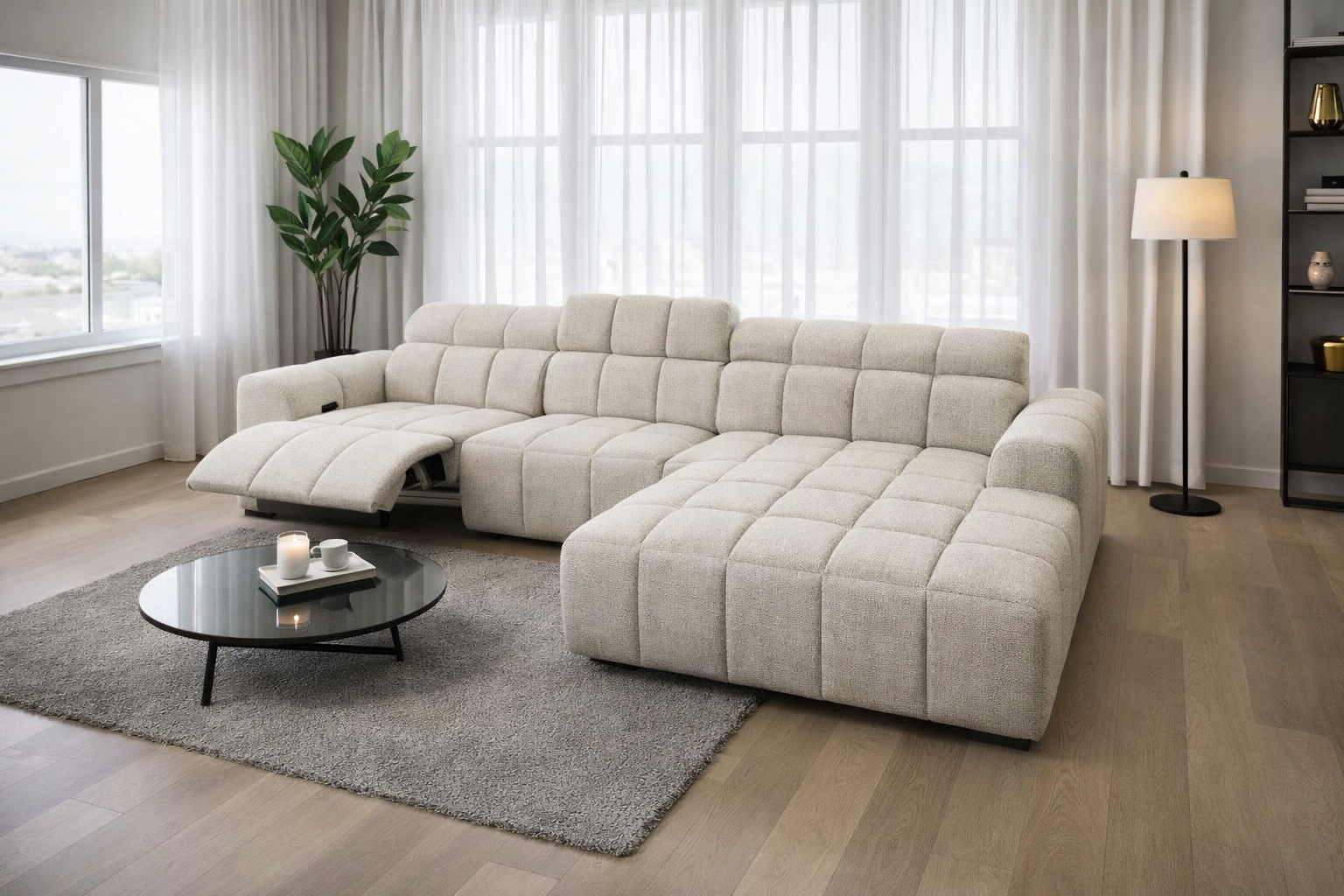 Ce canapé d'angle compact en tissu léger allie design moderne et confort exceptionnel. Doté d'appuie-têtes réglables et d'un mécanisme de relaxation électrique , il est idéal pour se détendre dans un salon contemporain.