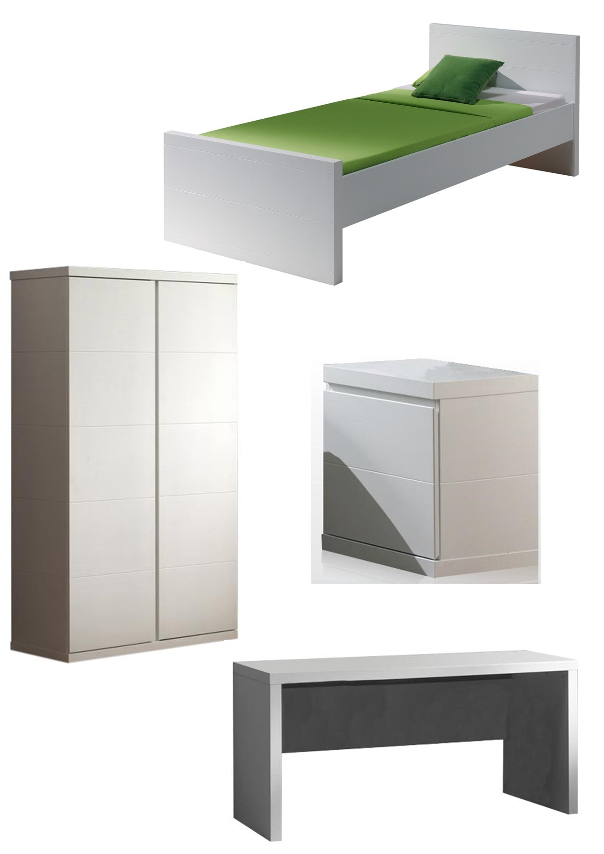 LARA-collectie: wit gelakt MDF met massief grenen; inclusief lattenbodem, soft-close deuren, horizontale freesdetails. Strak, modern ontwerp; compleet pakket: bed, nachtkastje, kleerkast en bureau.