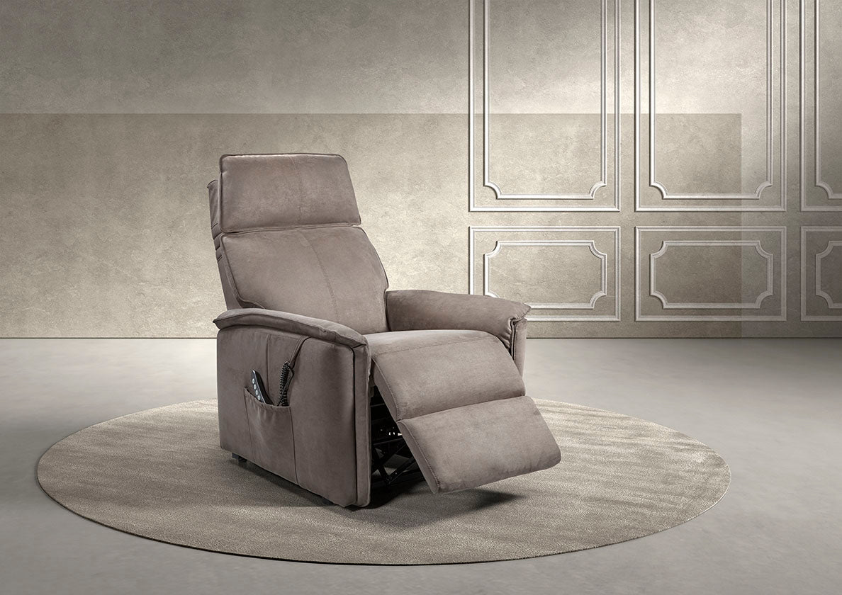 Hoogwaardige grijze stof, twee motoren: liftfunctie en relaxfunctie en een elegant design met eenvoudige bediening