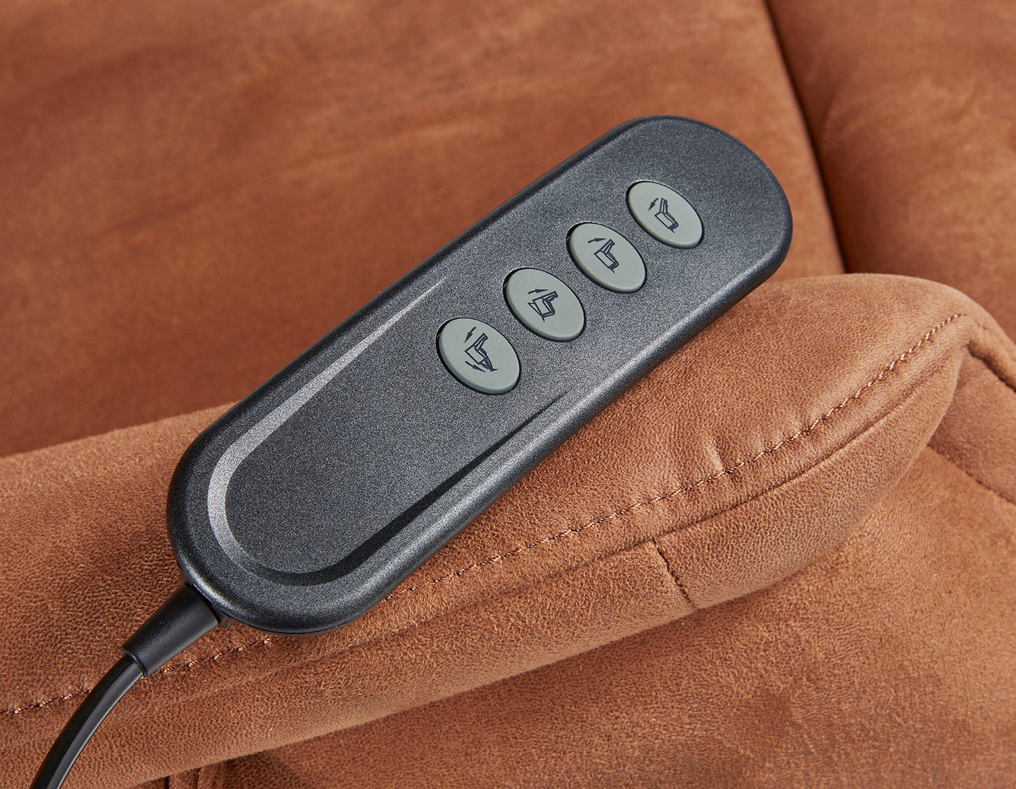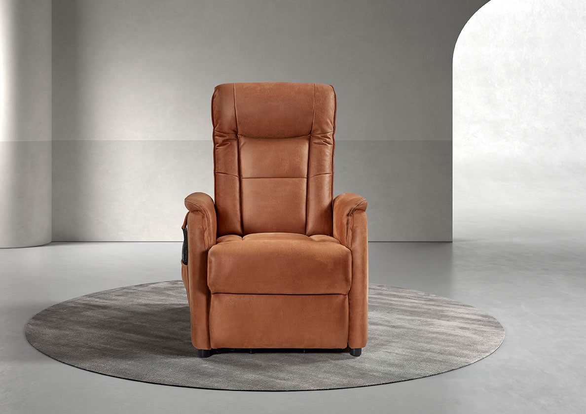 Hoogwaardige cognac stof, twee motoren: liftfunctie en relaxfunctie en een elegant design met eenvoudige bediening