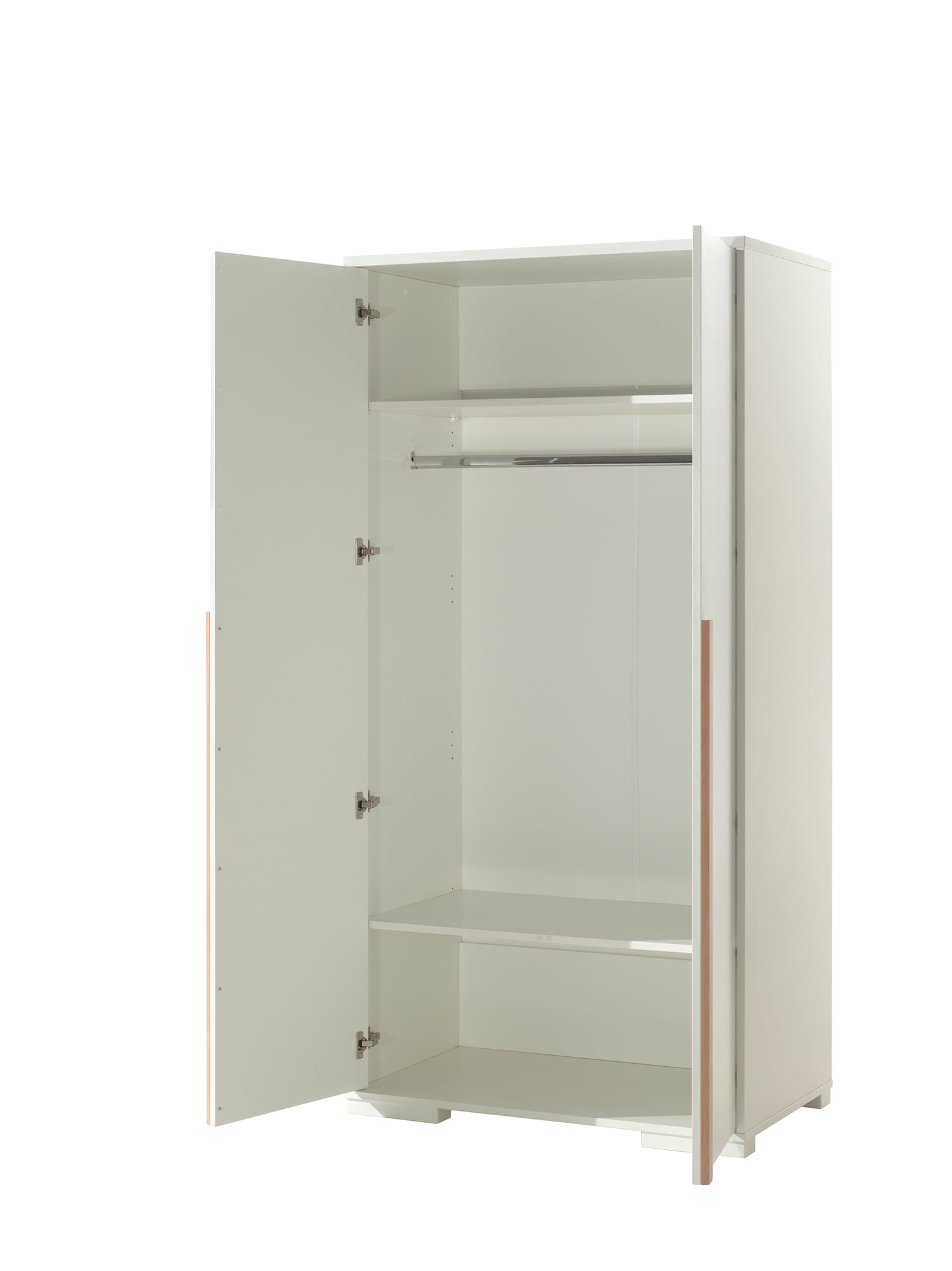 LONDON 2-deurs kleerkast in wit met Scandinavisch karakter dankzij massief grenen; biedt twee legplanken en een brede hangrail over de volle breedte, melamine-afwerking.