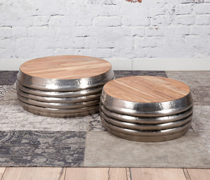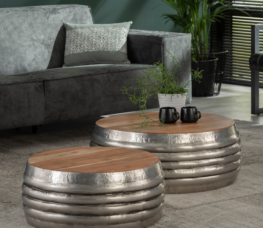 Stijlvolle set salontafels met een warme houten top en modern nikkel stalen frame. Perfect voor een eigentijdse woonkamer.